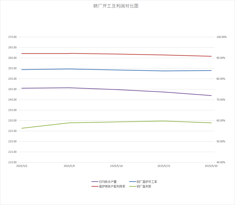 需求方面,5月钢厂高炉开工整体情况保持高位稳定,主要在于钢厂利润相对稳定,生产积极性较好,铁水产量维持高位。5月由于下游开工情况良好,钢材成交情况好转。短期内钢厂利润尚可支撑现有生产规模,当前螺纹钢吨利润高于100元,铁水产量维持在240万吨以上,而6月随着下游采购放缓,那么铁水产量会有所缩减,但具体增加情况还要看钢厂利润情况以及下游钢材成交情况,6月初铁矿需求或小幅缩减。