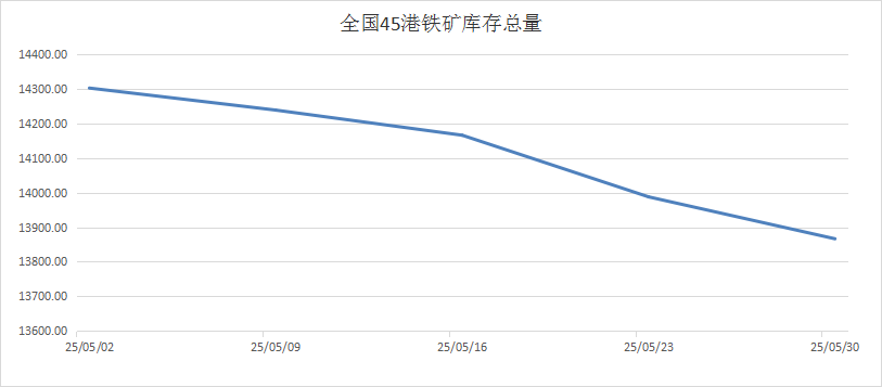 库存方面,截至5月25日,全国45个港口进口铁矿库存为13866.58万吨,周环比jians121.25万吨,月环比减少435.9万吨;日均疏港量为326.68万吨,周环比减少0.41万吨,月环比减少5.16吨;在港船舶数80条,与4月底相比减少12条。上周铁矿港口库存情况如上图;全国钢厂进口铁矿库存总量为8754.33万吨,月环比减少37.42万吨。5月以来随着钢厂高炉复产不断,开工规模维持高位水平,使得钢厂提货需求增加,所以日疏港量增长。钢厂利润情况好转提高开工积极性,钢厂厂内库存不断消耗,港口库存维持去库。现阶段钢铁后续行情还是要看下游钢材成交情况,如果6月钢材市场仍能维持现有成交量,钢厂铁矿需求释放韧性可期,铁矿港口库存有继续去库可能。
