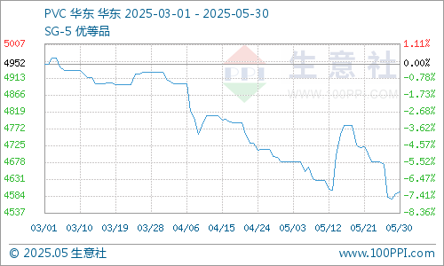 上游电石方面,本周(5.26-30),电石市场持稳为主,据生意社商品分析系统,本周涨跌幅为0。但进入5月以来,电石价格只跌不涨,5月跌幅在2.44%,目前在相对低位,对PVC支撑有限。