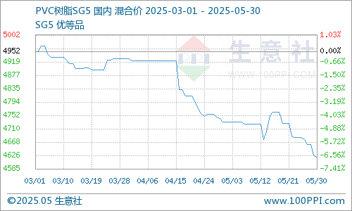 据生意社商品行情分析系统监测显示,5月份国内PVC现货市场延续上月跌势,月中行情短暂反弹,下旬重回下行通道。截止5月30日,国内PVC均价4597元/吨,整月价格下跌1.75%。
