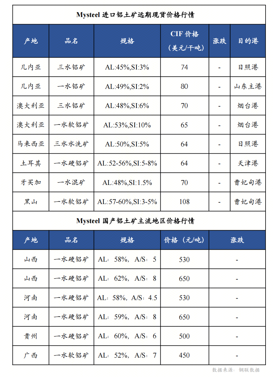 1月6日国产铝土矿价格平稳运行。国产矿山维持常态开工,采暖季环保压力增加,下游氧化铝企业国产矿库存始低位,现货难寻支撑国产矿现货报价坚挺。 进口矿方面价格高位平稳运行。几内亚发运恢复,梅特罗雨季将影响至2025年2月,期间发运量减少。