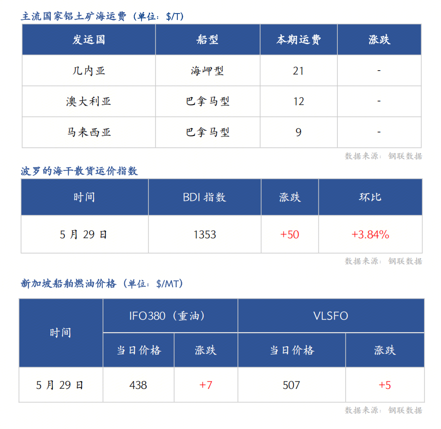 5月30日铝土矿价格总体持稳,几内亚海运费有所上涨,新加坡船舶燃油价格有所回升。