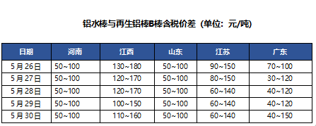 【我的钢铁】5月30日A00铝锭现货价华东20280,跌90;华南20150,跌80;中原20220,跌80(单位:元/吨) 。再生棒厂积极调价出货为主,品牌价差50-100元/吨,今日再生铝棒价格下跌50-100元/吨。