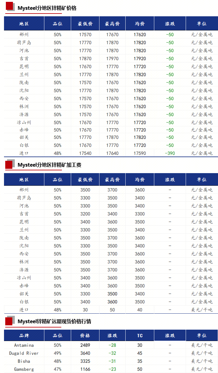 今日受锌价的影响,锌精矿价格较昨日下跌50元/金属吨,各地区加工费未调整。进口TC市场主流报价在30-50美元/干吨,和上一交易日持平。