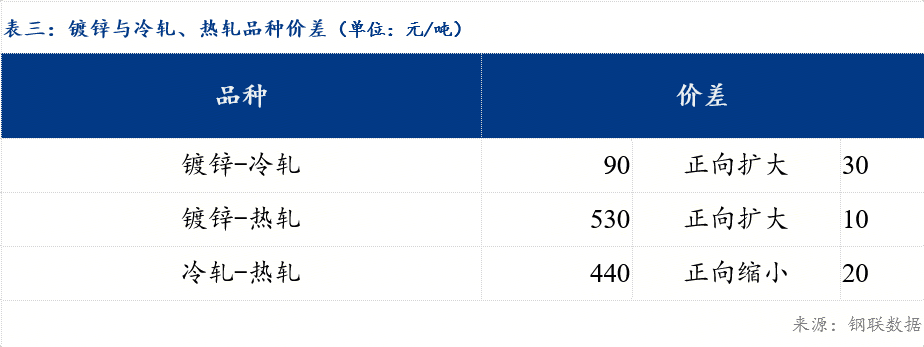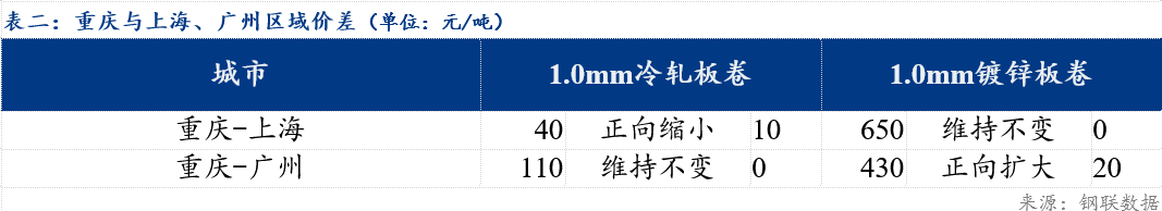 重庆、上海地区冷轧板卷区域价差缩小10元/吨;重庆、广州冷轧板卷区域价差维持不变。重庆、上海镀锌板卷区域价差维持不变;重庆、广州镀锌板卷区域价差扩大20元/吨。镀锌、冷轧品种价差扩大30元/吨;镀锌、热轧品种价差扩大10元/吨 ;冷轧、热轧品种价差缩小20元/吨。