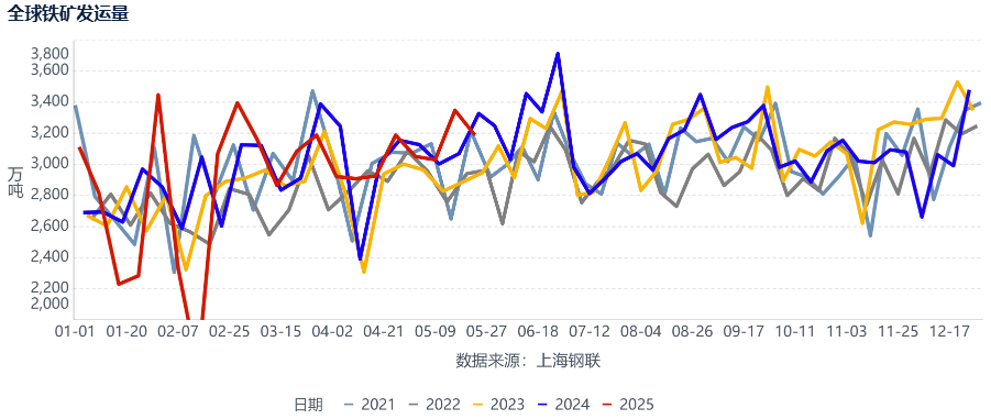 供应方面,5月份以来海外矿山发运量逐步回升,铁矿供应呈现一定的扩张状态。根据上海钢联调研数据:今年以来,全球铁矿周度发运量均值为2916万吨,同比下降26万吨,降幅持续收窄。随着矿山财年末期的临近,为完成全年发运量目标,矿山通常会加大发运力度。预计6月份铁矿发运量将呈现持续回升的状态,供应压力随之而有所加大。