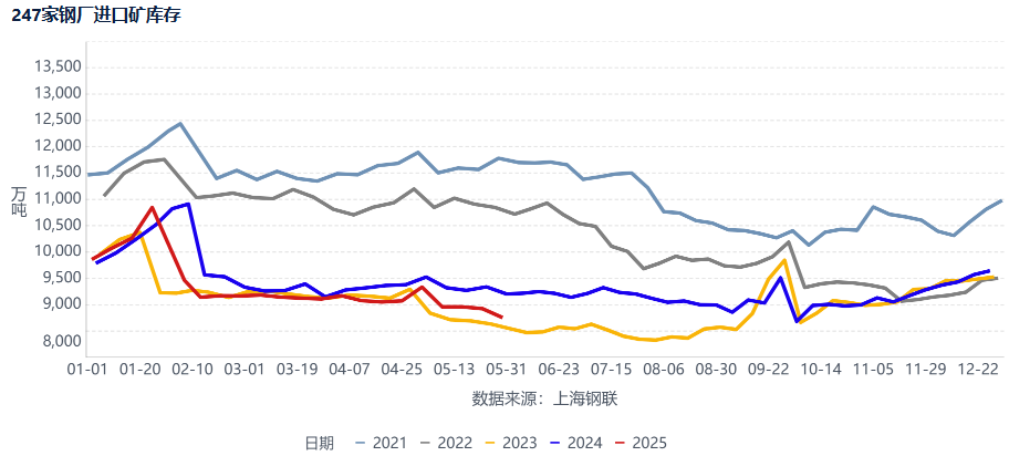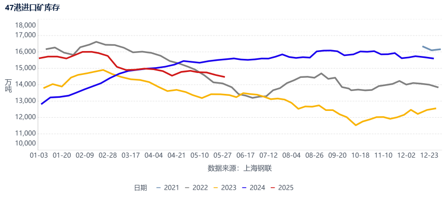 上半年,铁矿需求持续改善回升,而供应则整体呈现收缩下滑态势。在此环境下,铁矿供需阶段性错配,从而带动库存持续回落,库存压力随之而逐步缓解。根据上海钢联的调研数据,目前47港铁矿石库存14592万吨,同比下降,降幅达到915万吨。钢厂进口矿库存8925万吨,同比下降413万吨。