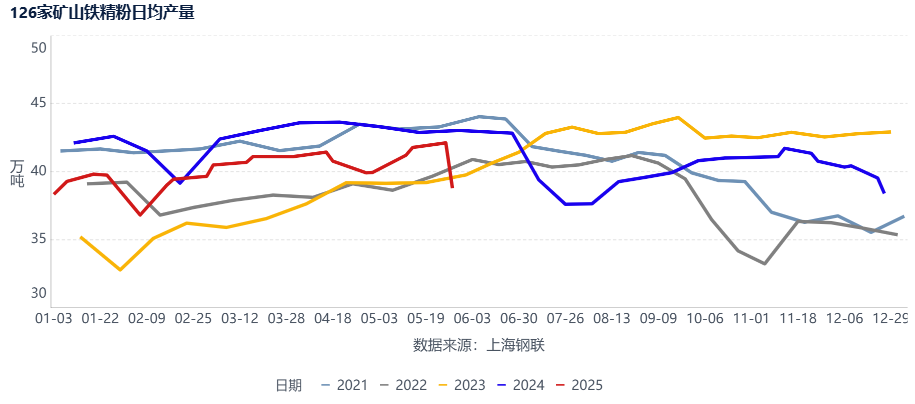 国产矿供应同样呈现回升状态。5月以来国内矿山铁精粉产量低位逐步回升。根据上海钢联调研的126家矿山的铁精粉日均产量数据来看:当前日均产量42.1万吨,环比增1.3万吨,同比下降1万吨,降幅逐步收窄。