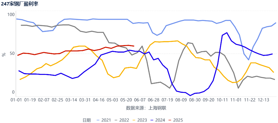 5月份以来,受益于原料价格的持续下跌,钢厂盈利状况有所改善。从上海钢联的调研数据来看,目前247家钢厂整体盈利率为59.7%,环比4月底上升4.7个百分点,同比增长5.6个百分点。随着钢厂盈利状况的改善,钢厂维持生产的意愿有所增强。这也就使得6月份钢厂生产负荷维持较高水平的概率加大,除非出现政策性控产的情况。