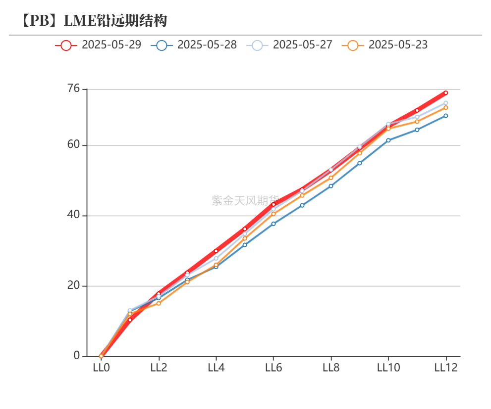 结构上看,外盘维持Contango结构,LME铅0-3贴水走强,于-20美金/吨附近运行。
