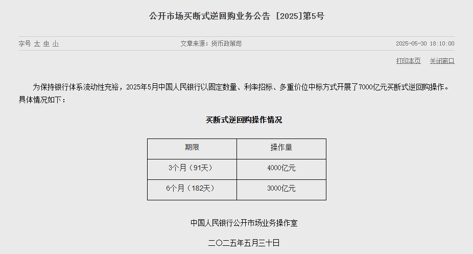 5月30日,央行发布公告,为保持银行体系流动性充裕,2025年5月中国人民银行以固定数量、利率招标、多重价位中标方式开展了7000亿元买断式逆回购操作。