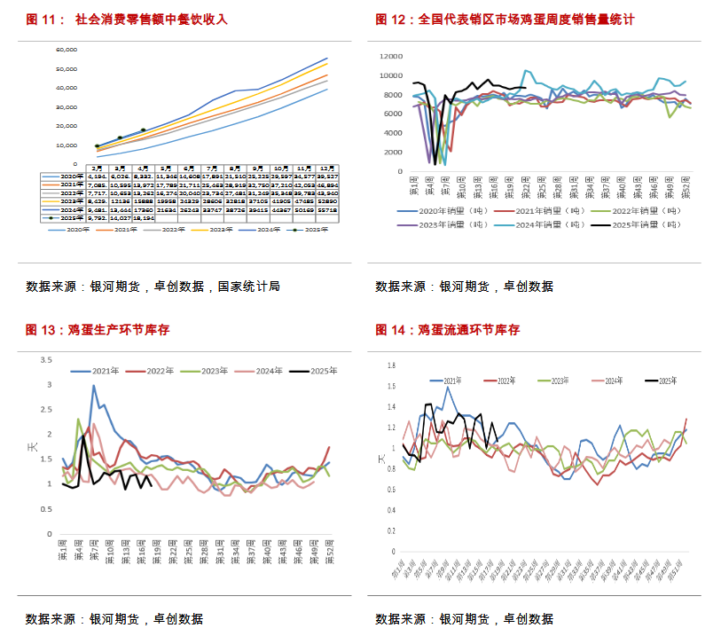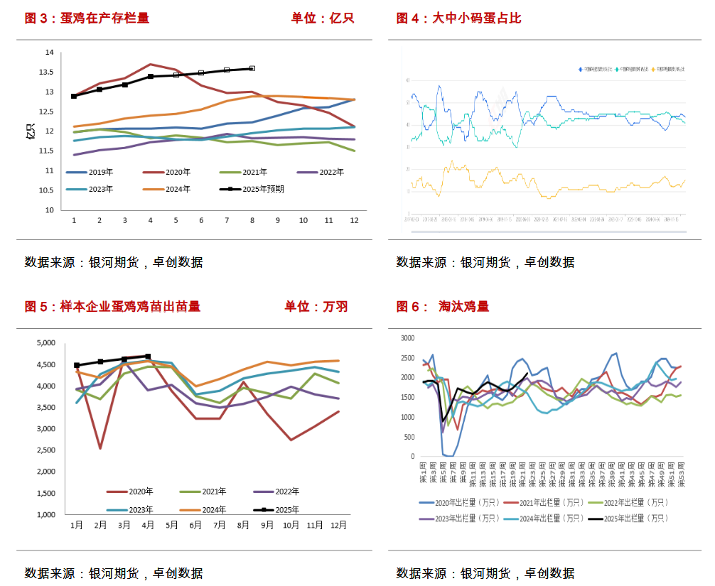供应端:根据卓创数据4月份全国在产蛋鸡存栏量为13.29亿只,较上月增加0.11亿只,同比增加7.2%,高于之前预期。不考虑延淘和集中淘汰的情况下,根据之前的补栏数据可推测出2025年5月、6月、7月、8月在产蛋鸡存栏大致的数量为13.32亿只、13.37亿只、13.45亿只和13.49亿只。