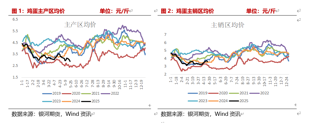 2025年5月鸡蛋现货价格走势偏弱。供应端继续维持宽松状态,去年四季度以及1、2月大量补栏导致当前开产蛋鸡量增加较为明显,淘汰量五月中下旬开始有所增加,供应端给市场带来的压力非常明显,需求端端午节有所备货但对蛋价支撑相对有限,蛋价整体继续偏弱势运行,5月主产区均价最低跌至2.88元/斤附近。