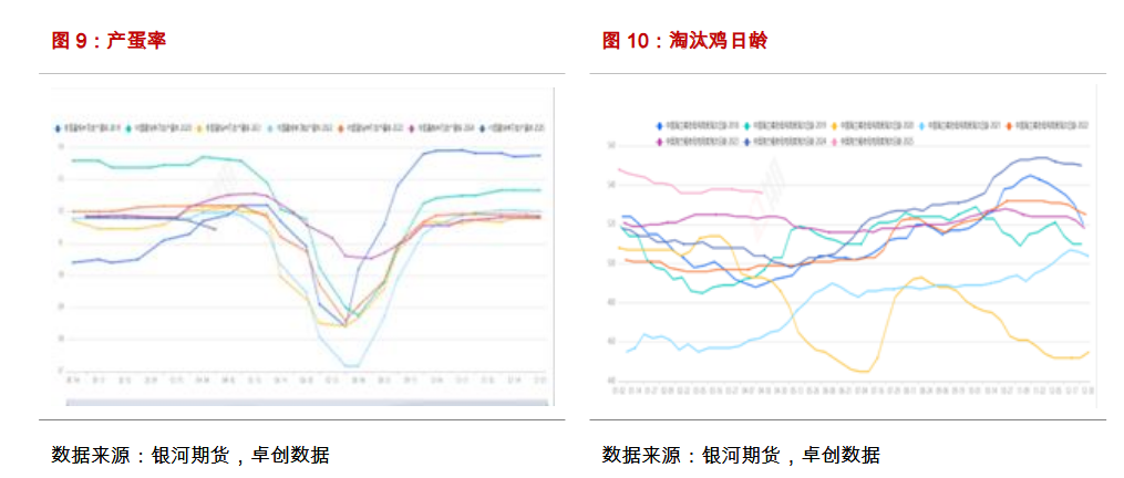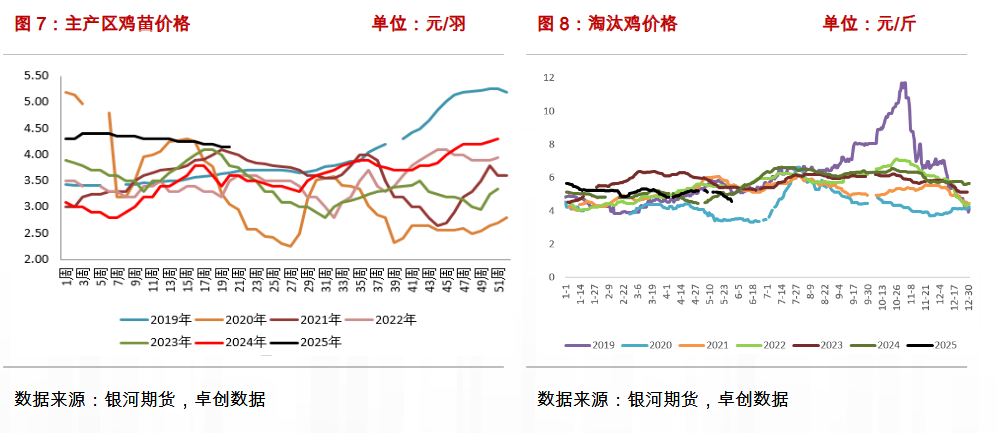 供应端来看,由于前期补栏量处于偏高位置,预计5、6月份新开产蛋鸡量仍将处于高位。产蛋率方面随着天气逐渐转热,产蛋率将有所下降,对鸡蛋供应有一定缓解。淘鸡方面来看,随着5月蛋价持续下跌使得淘汰量有所增加,且考虑到后续梅雨季影响预计淘汰量将处于高位,对供应压力可能会有一定缓解。