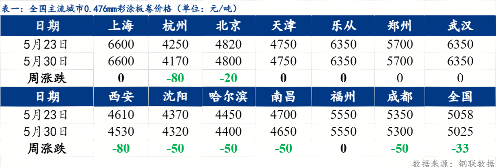 全国主流城市0.476mm彩涂板卷均价下跌33元/吨,现均价为5025元/吨,各市场下跌幅度在20-80元/吨。