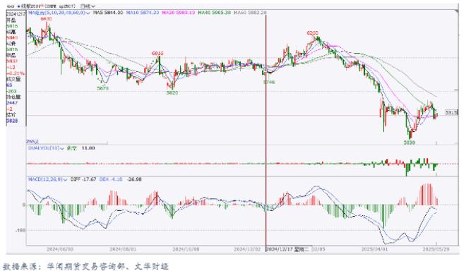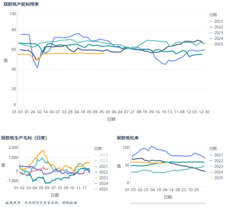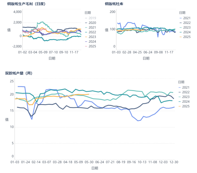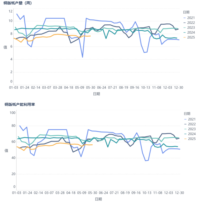 4月纸浆基本面偏弱的情况下,受美国关税政策扰动,期货主力合约骤降跌至2023年以来最低水平。5月以来浆价向上缓慢修复,至5月28日,纸浆主力合约报5326元/吨,较4月涨约4.7%。现货价格下调。其中山东银星下调136至6241,东北俄针下调113至5343元/吨。