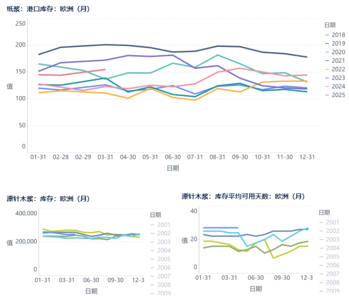 国际方面,欧洲3月纸浆库存155万吨,环比继续回升,较2024年同期库存压力偏高,可用库存天数维持在27天,处于历史高位。Europulp公布的数据显示,2025年4月欧洲木浆港口库存为135.2万吨,较上月的155.0万吨下滑12.8%,较去年同期的119.0万吨增加13.6%。港口库存仍在历史高位。巴西5月出口纸浆数量进一步增加,纸浆供应压力或有增加。
