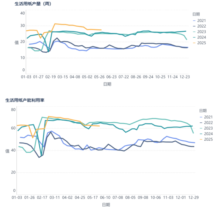 生活用纸4月产量125.8万吨,较上月减少6万吨。至5月23日,生活用纸5月产量约83.1万吨,产量环比下滑明显,同比处于历史高位。出口13.1万吨,环比降1.91%。开工情况来看,周度产能利用率均值为62.6%,4月产能利用率为66.5%,5月开工环比下滑,处于三年同期相对低位。4月生活用纸社库129.8万吨,较上月基本持平。生产企业库存63.42万吨,库存可用天数20.7天,同比处于相对高位。隆众资讯数据显示,5月生活用纸市场均价下调至6042元/吨,环比降3.1%。整体来看,生活用纸需求没有明显改善,采购刚需为主,补库意愿一般,预计6月生活用纸延续5月态势。