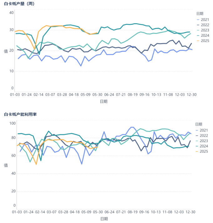 4月白卡纸产量132万吨,环比减少10万吨,同比增加1万吨,产量处于近五年高位水平。产能利用率75%,较上月下降3.02个百分点。5月周均产量28.5万吨左右,低于4月周均水平。产能利用率周均70%左右。截至5月29日,白卡纸厂库库存93万吨,环比减少2.52%。从产量和库存数据来看,白卡纸需求有小幅恢复。5月下旬纸厂有涨价计划,对市场信心有提振。但价格提升或抑制下游采购积极性,预计6月白卡纸需求稳定,等待市场对涨价的反馈。