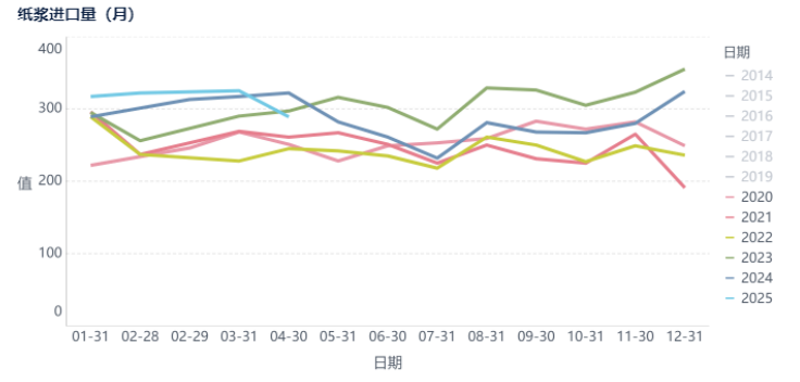 据海关总署数据显示,2025年4月纸浆进口量289.3万吨,环比降11%,同比降10.3%,全年累计进口量1253.1万吨。