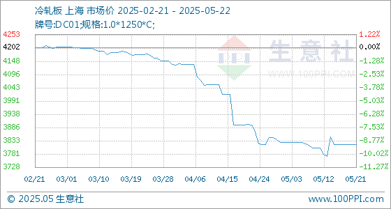5月22日生意社冷轧板基准价为3817.50元/吨