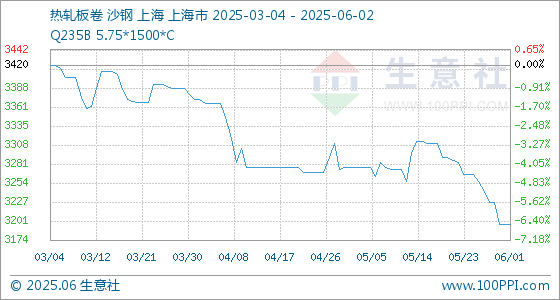 6月2日生意社热轧板卷基准价为3196.67元/吨