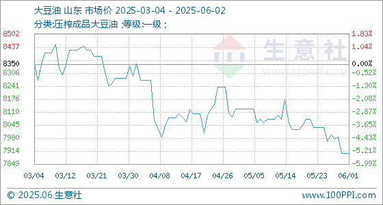 6月2日,生意社大豆油基准价为7904.00元/吨,与本月初持平。