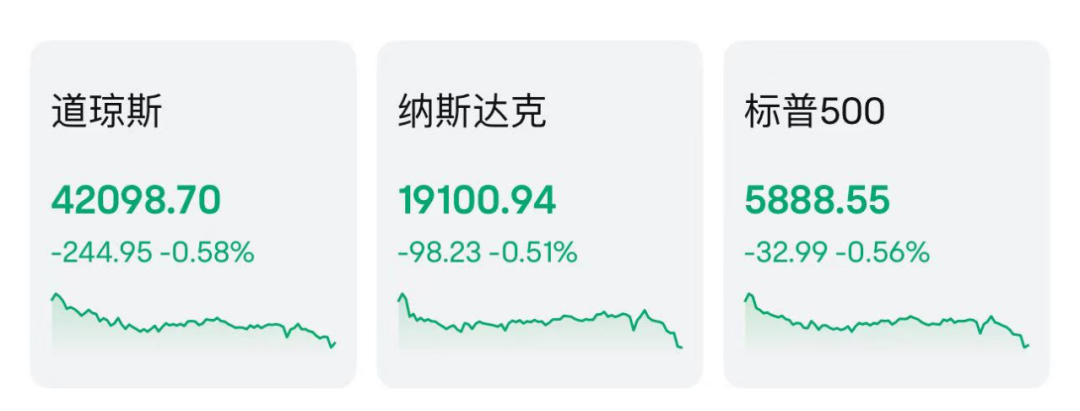 美东时间周三,美股三大股指集体收跌。截至收盘,道指跌0.58%,报42098.70点;纳指跌0.51%,报19100.94点;标普500指数跌0.56%,报5888.55点。