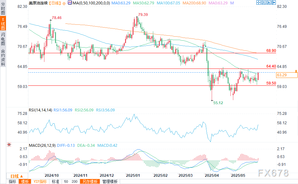 汇通财经APP讯——周一(6月2日),原油价格大幅上涨,WTI原油期货涨幅超过4%,并突破关键阻力位。西德州中质原油(WTI原油)价格跃升至62.79美元的50日均线之上,多头目前目标瞄准64.19美元的小顶部。关键阻力位仍为64.40美元,若突破该价位,将为测试68.90美元的200日均线打开大门。支撑位在59.74美元至59.51美元之间。