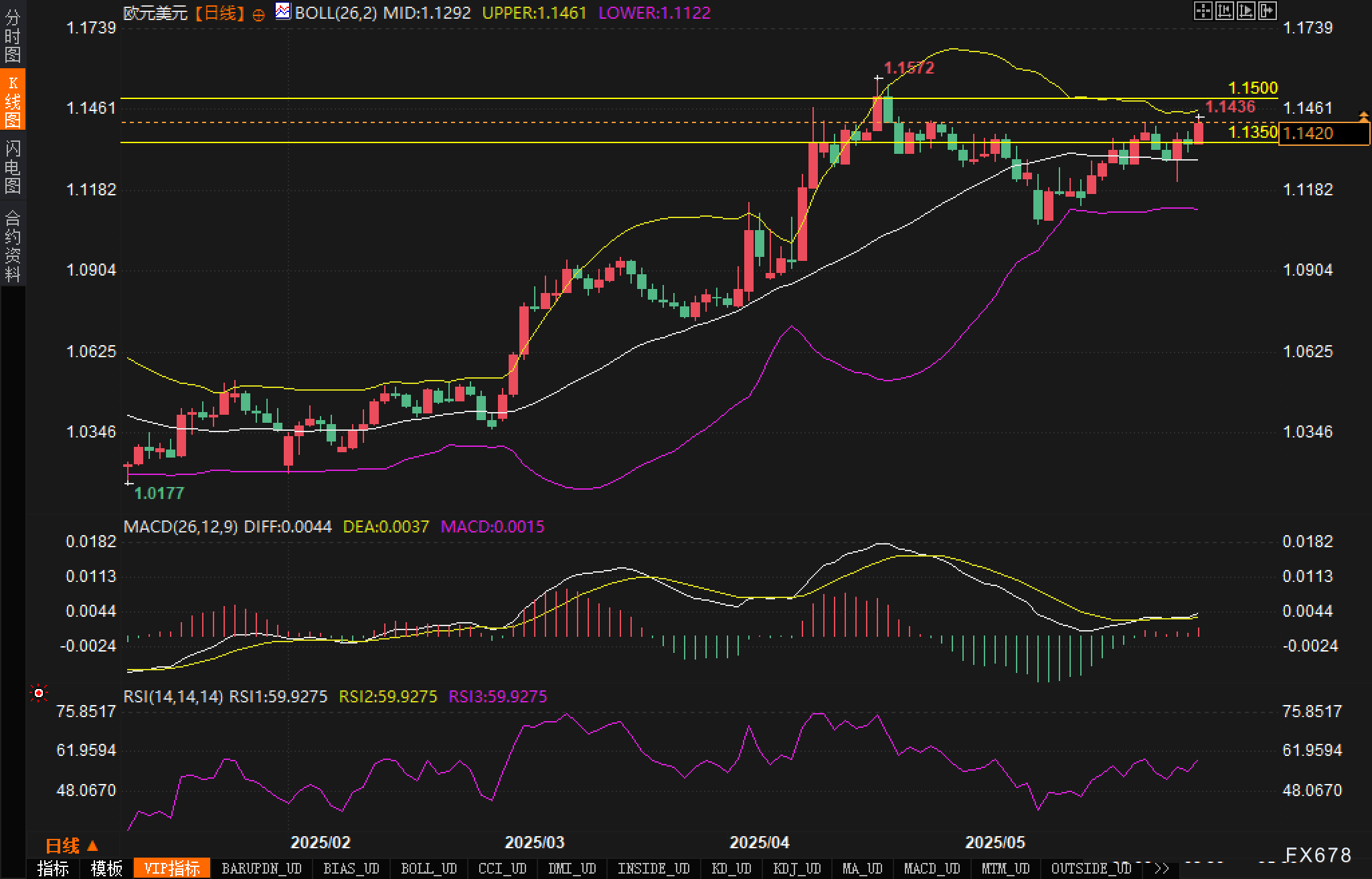 关键支撑位关注1.1350和1.1230,关键阻力位关注1.1461(布林带上轨)。若汇价有效突破1.1461,则有望挑战1.1500整数关口;反之,若跌破1.1350支撑,则可能回测1.1230一线。