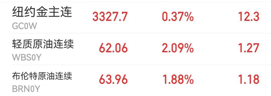 周一(6月2日)亚太盘初,黄金、原油齐涨。截至发稿,现货黄金上涨0.37%,报3327.7美元/盎司。WTI原油期货上涨2.09%,报62.06美元/桶,布伦特原油期货上涨1.88%,报63.96美元/桶。