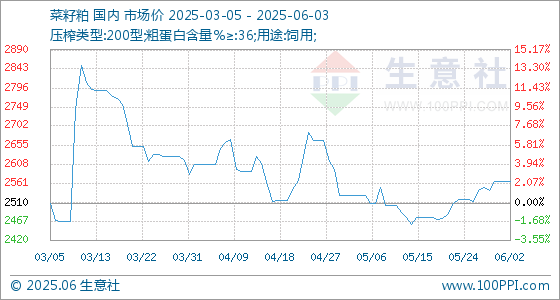 6月3日,生意社菜籽粕基准价为2565.00元/吨,与本月初持平。