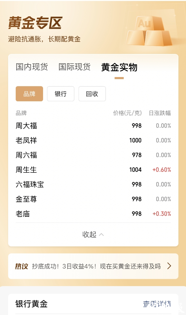国内黄金零售市场方面,实时金价统计显示,水贝黄金价格为780元/克;周六福为978元/克;老庙涨至998元/克,涨幅0.3%;周生生黄金价格涨至1004元/克,涨幅0.6%,上涨超过6元;周大福、六福珠宝、周大生等品牌黄金价格均为998元/克,与前一日价格持平;老凤祥黄金价格为1000元/克。