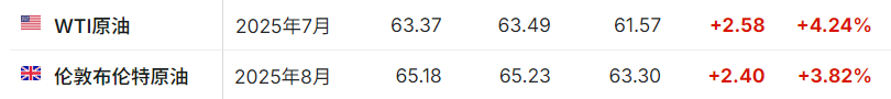 3. 截至发稿,WTI原油涨4.24%,报63.37美元/桶。布伦特原油涨3.82%,报65.18美元/桶。