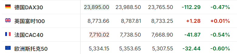 2. 截至发稿,德国DAX指数跌0.47%,英国富时100指数涨0.01%,法国CAC40指数跌0.54%,欧洲斯托克50指数跌0.60%。