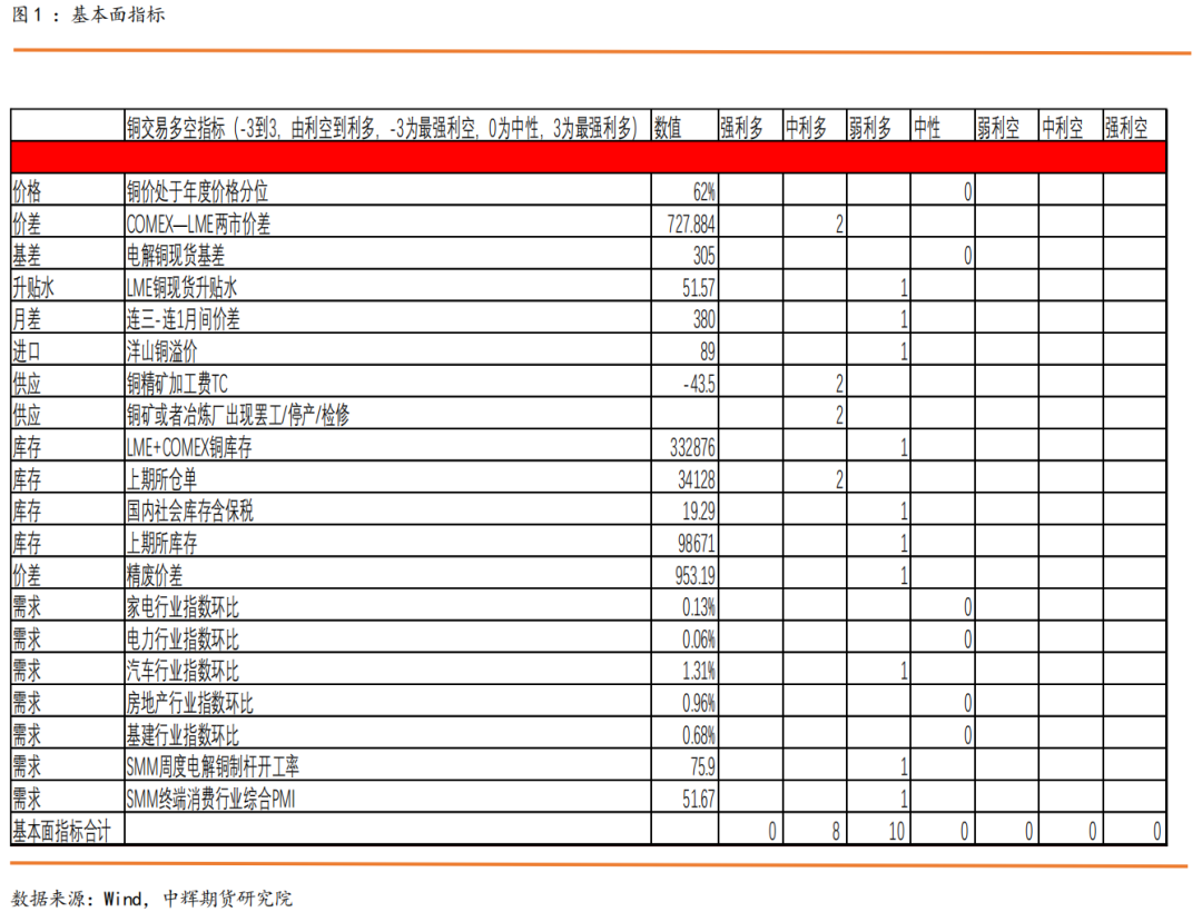 6.洋山铜溢价,当溢价>50美元/吨,代表进口需求旺盛,市场交投积极,当前洋山铜溢价处于历史同期高位,赋予其弱利多1。