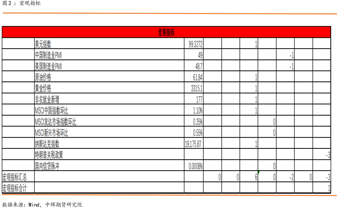 5.非农就业新增超预期,美国经济衰退担忧减弱但是削弱了美联储降息预期,并且关税战下我们对非农数据的真实性存疑,暂且赋予其弱利多1。
