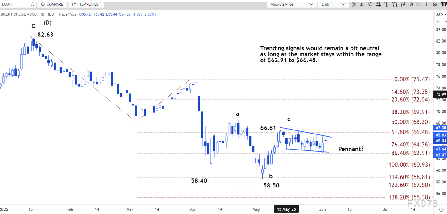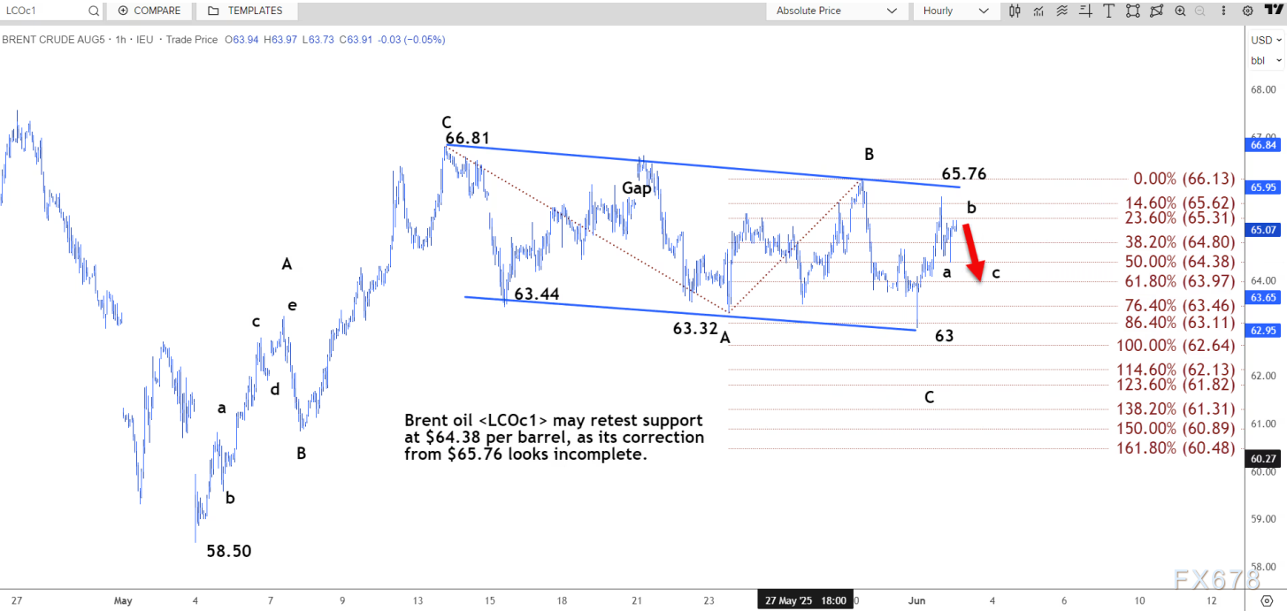 路透技术分析师指出,布伦特原油可能重新测试每桶 64.38 美元的支撑位,因为其从 65.76 美元的回调看起来尚未完成。