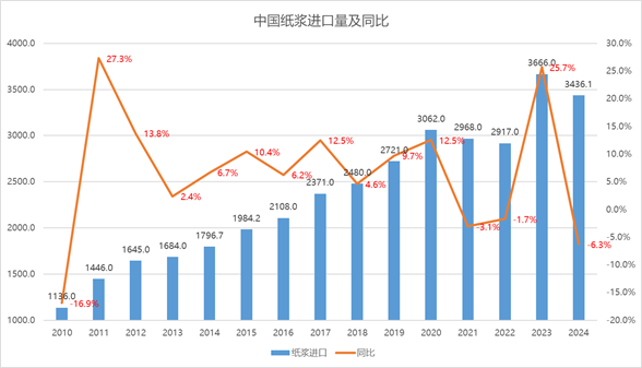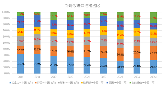 我国纸浆,尤其是针叶浆仍依赖于进口,美国作为中国针叶浆前五大进口来源国(2024年占比12%),进口关税的提升不可避免会影响纸浆进口量和进口来源的变化,从而对纸浆供应产生影响。