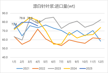 从我国漂白针叶浆进口数据来看,2025年4月漂白针叶浆进口数量75.8万吨,环比-5.0%,同比-7.6%。全年累计进口量308.1万吨,累计同比-2.9%。4月漂白针叶浆环比出现实际减量,从进口来源结构上,2025年4月我国进口美国针叶浆数量8万吨,环比-3.6%,同比-12%;全年累计进口量32万吨,累计同比-24%;对应地,2024年1-4月美国进口占比继续下滑至10.4%,俄罗斯及其他来源国占比提升。