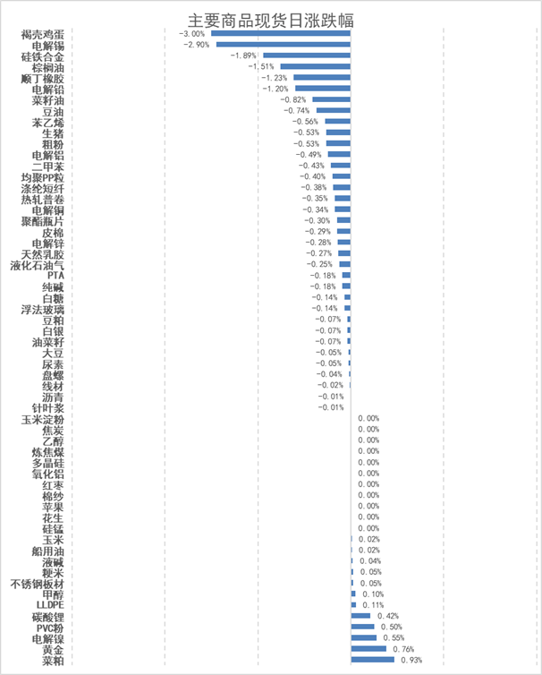 5月30日,卓创资讯监测商品现货市场12种上涨、35种下跌,11种企稳。锡矿复产影响持续,电解锡继续下行。棕榈油增产供给宽松令油脂价格整体承压。宏观层面关税风险仍存,需求乏力仍对合成橡胶形成拖累。水产市场养殖端饲料需求改善,带动菜粕价格上涨。(价格涨跌幅均以卓创资讯监测现货商品均价或主流市场价格计算)