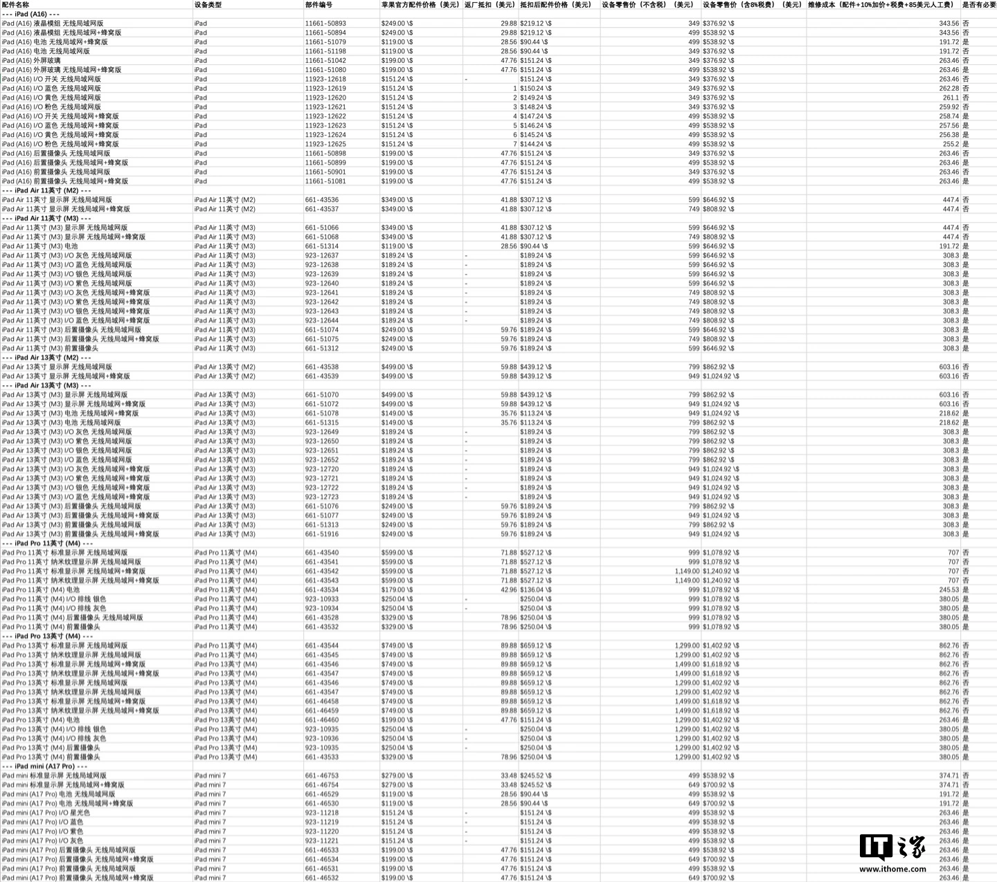 虽然相应愿景看起来很美好,但独立维修公司 XiRepair 创办人 Jonathan Strange 指出,苹果原厂配件定价“高到令人咋舌”,以至于“维修根本不划算”,其同时出示了苹果具体配件定价表,表示如果 iPad 存在多重维修需求(例如需要同时换屏幕和电池)时,维修价值较低。