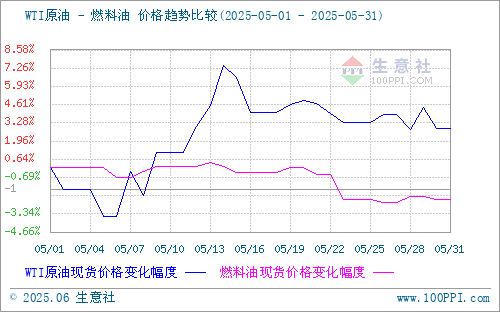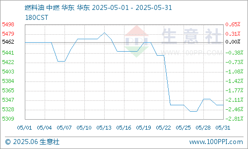 据生意社商品分析系统显示,5月份国内华东地区船燃市场行情整体下跌。截至5月31日国内燃料油180CST均价为5337.50元/吨,较5月1日的5462.50元/吨,下跌2.29%。