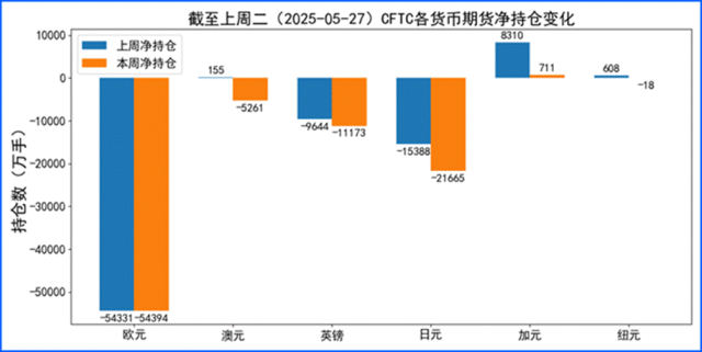 据美国商品期货委员会公布的2025-05-27期货市场头寸持仓报告显示,上周各货币的报告总持仓情况如下:欧元净空头变化63手,澳元净空头变化5416手,英镑净空头变化1529手,日元净空头变化6277手,加元净空头变化7599手,纽元净空头变化626手,上周总持仓多空转换的货币有:澳元,纽元。除此之外,单向总持仓变动超过20%的货币有:日元。