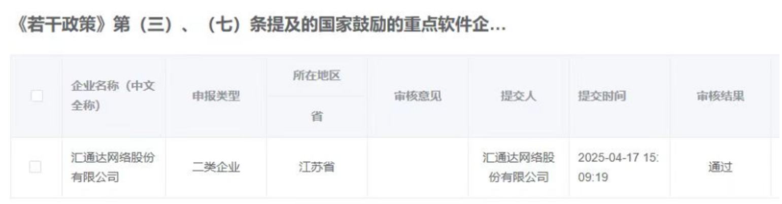 5月31日,汇通达网络(09878)通过“国家鼓励的重点软件企业”认定,这是自2022年以来,公司连续第4年获此认定。