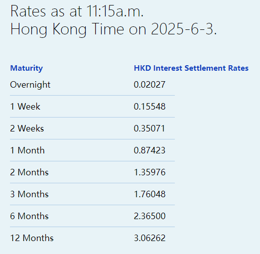 6月3日,港元一个月及以下拆息全线向下,其中,港元隔夜拆息进一步降至0.02027%,创2006年1月3日有纪录以来新低;而与楼按相关的一个月拆息亦由近两周高位回落至0.87423%。
