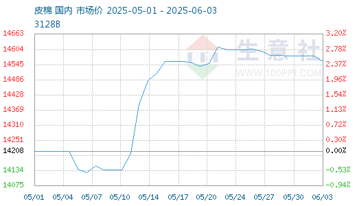 近期宏观扰动持续,基本面驱动有限,国内外棉价维持偏弱走势。据生意社商品行情分析系统,截至6月3日3128B级皮棉现货价格在14558元/吨,较节前下跌0.15%,周环比下跌0.27%。