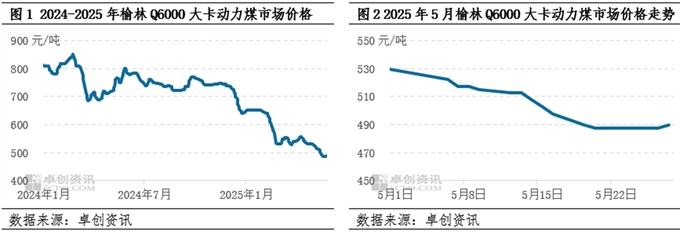 5月国内动力煤市场整体以持续下跌为主,至月底附近伴随供应收紧,个别刚需用户采购节奏也有改善,市场整体止跌,局部略有探涨。以榆林地区Q6000大卡动力煤为主,截至5月27日主流市场价格在485-495元/吨,较上月底累计下跌40元/吨,跌幅在7.55%;月均价在501.41元/吨,较上月均价下跌38.71元/吨,降幅在7.17%。