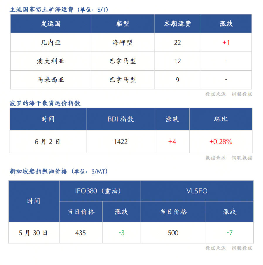 6月3日铝土矿价格总体持稳,几内亚海运费有所上涨,新加坡船舶燃油价格小幅下降。