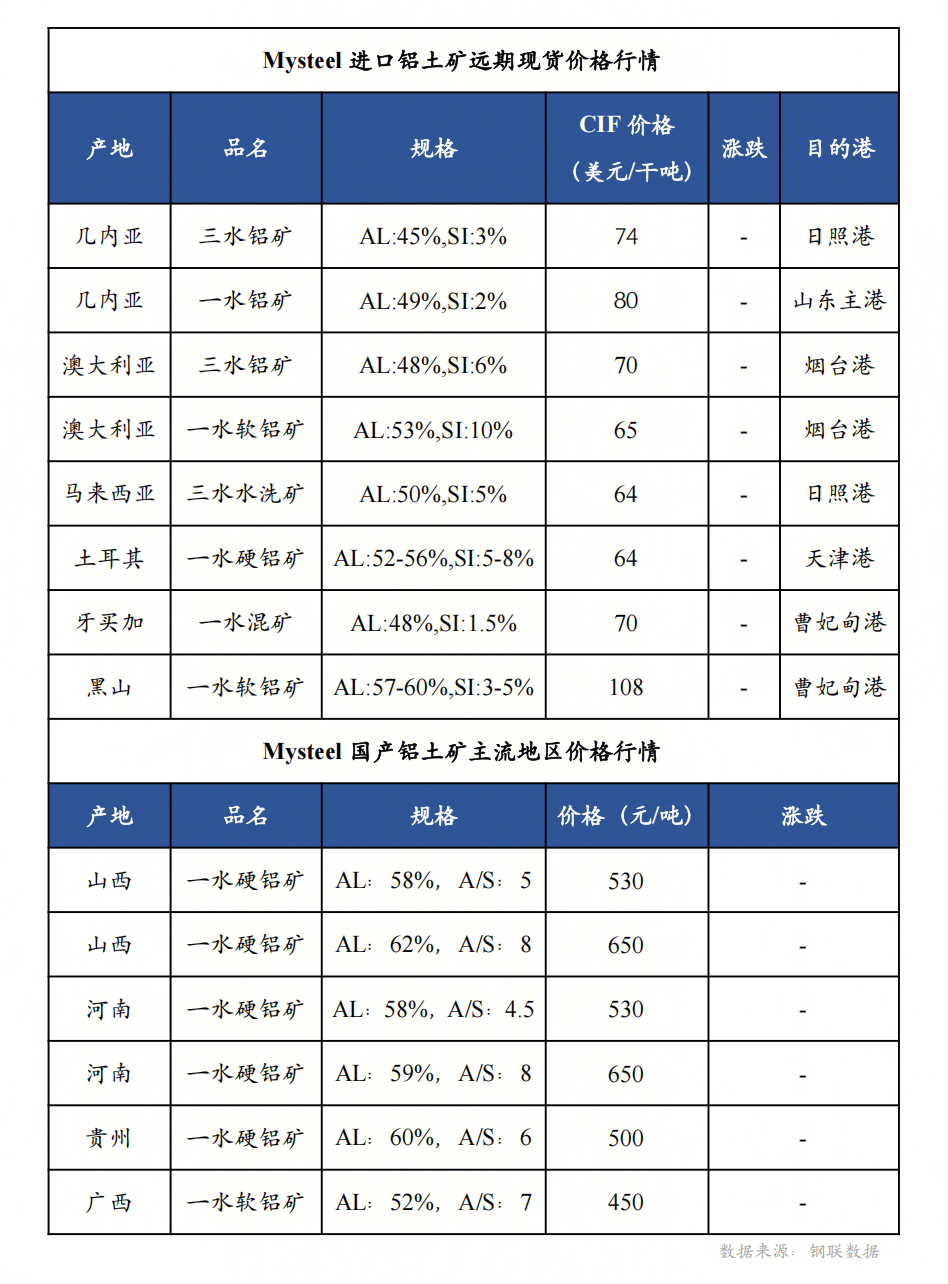 1月3日国产铝土矿价格平稳运行。国产矿山维持常态开工,采暖季环保压力增加,下游氧化铝企业国产矿库存始低位,现货难寻支撑国产矿现货报价坚挺。 进口矿方面价格高位平稳运行。据市场消息,,几内亚近日受到几内亚政局变动影响的矿企正逐步恢复正常,因堵路影响矿石运输和驳船暂停运输而影响发运的矿企均在逐步恢复,总体影响时长较短,长线来看对总发运量影响不大。...